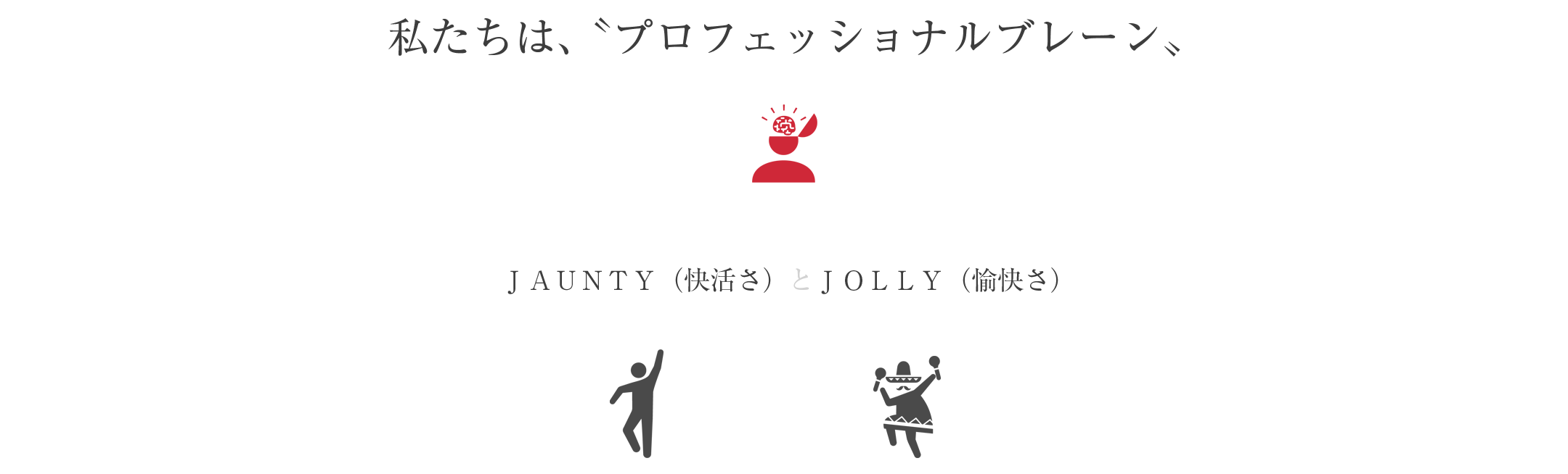 私たちは、〝プロフェッショナルブレーン〟として JAUNTY(快活さ)とJOLLY(愉快さ)を大切に、